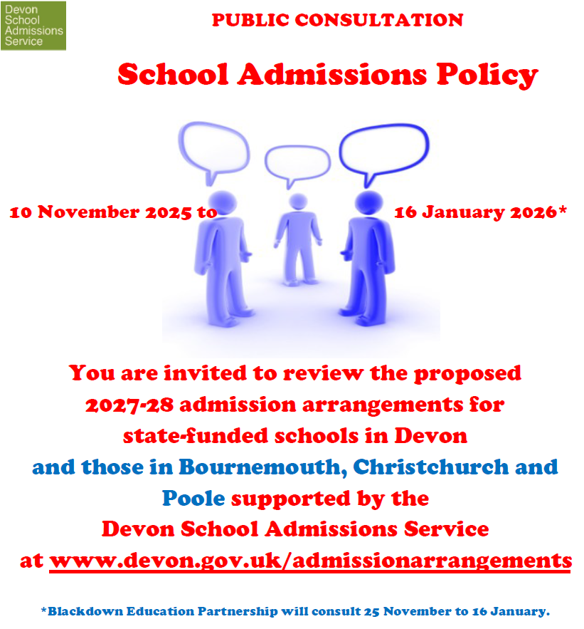 Along with all other schools and academies in Devon, we are consulting on an admission policy for 2027-28. The Local Authority is also consulting on its arrangements – the admissions schemes through which you can apply. You are invited to look at the proposal new policies which are based on policies for this year and next year and to have your say on them. If you have any comments regarding the policy we propose, you can contact us at the school or schoolsadmissionpolicy-mailbox@devon.gov.uk.